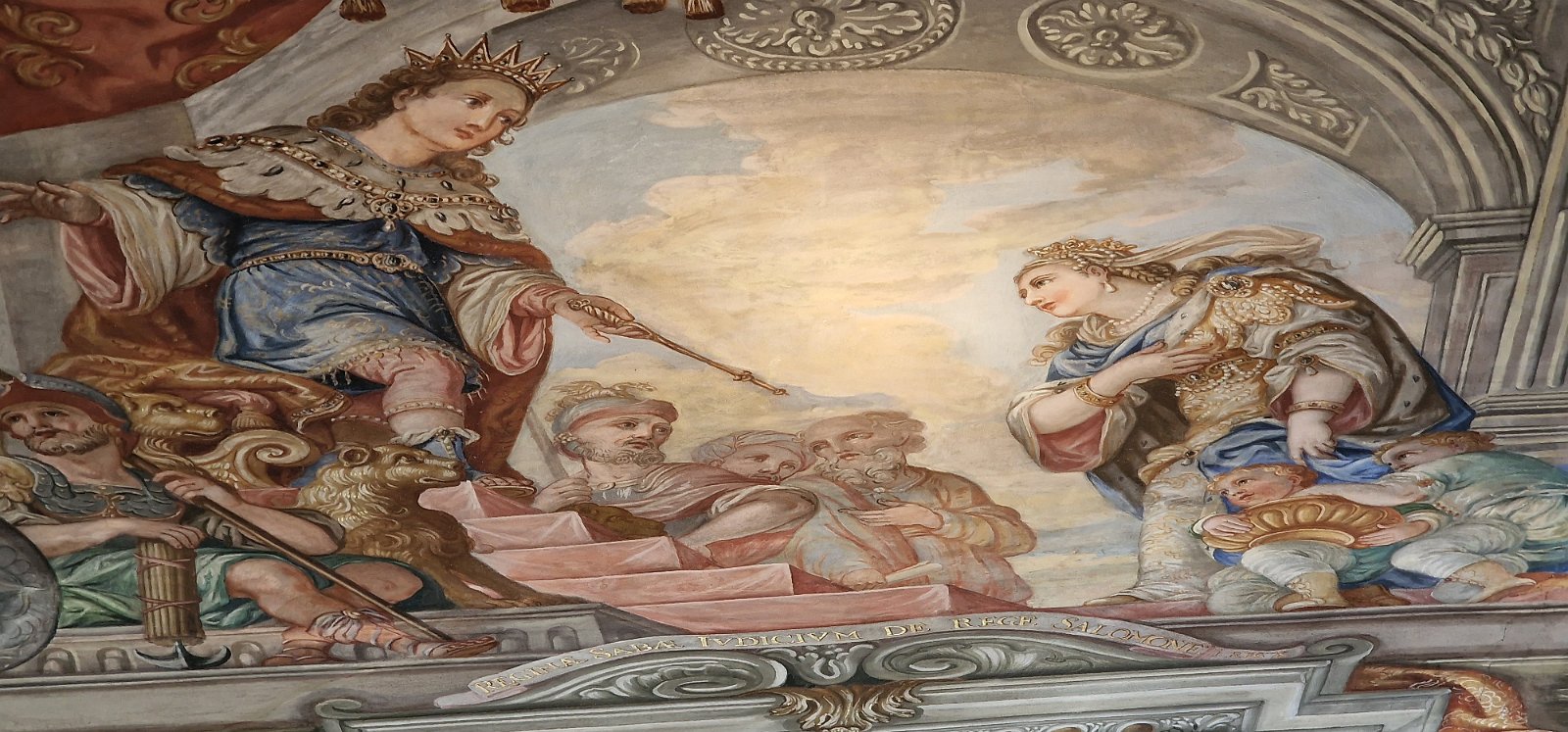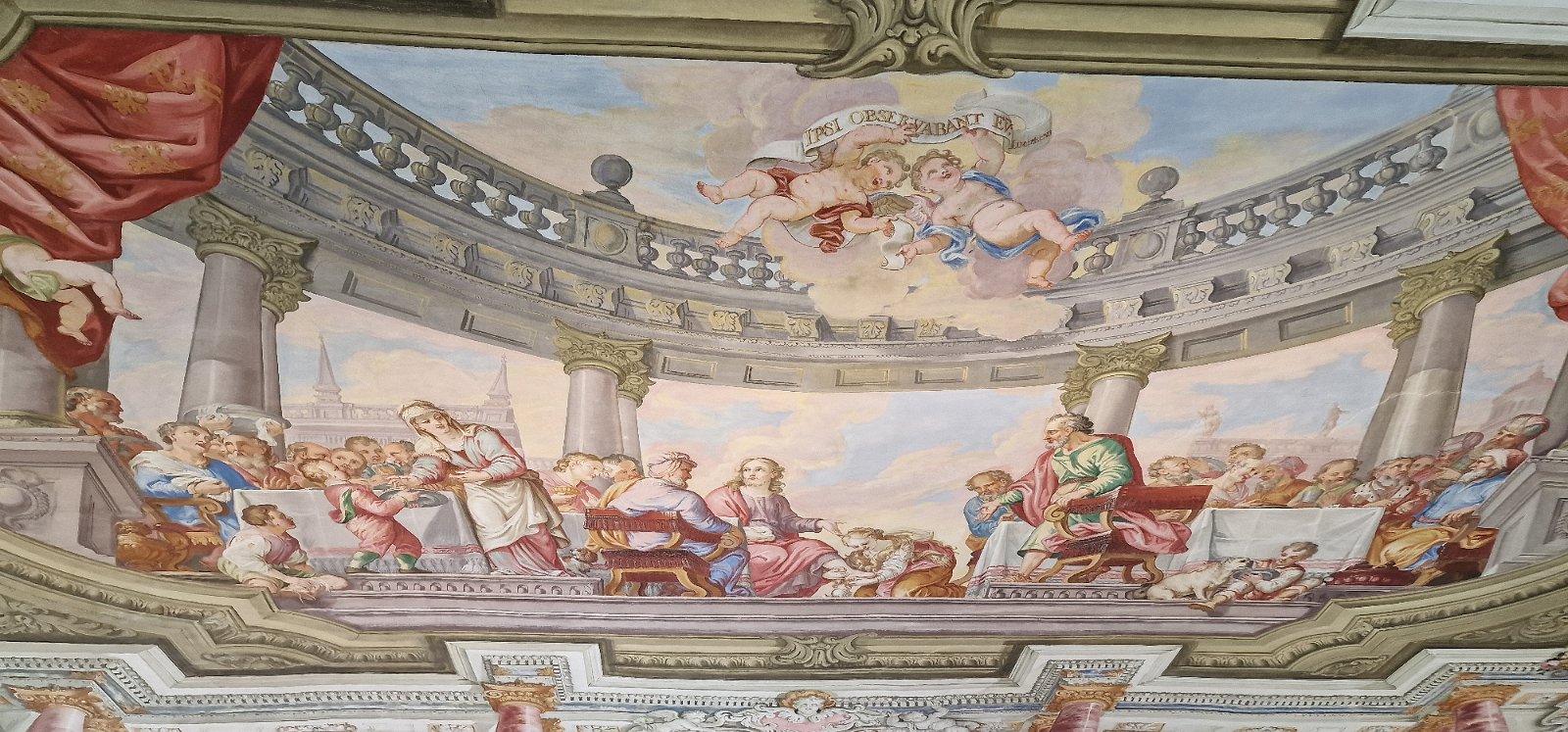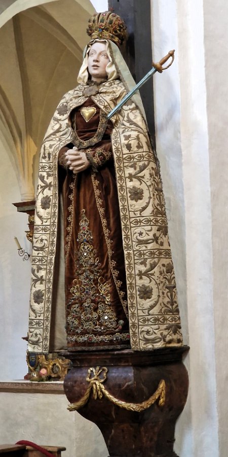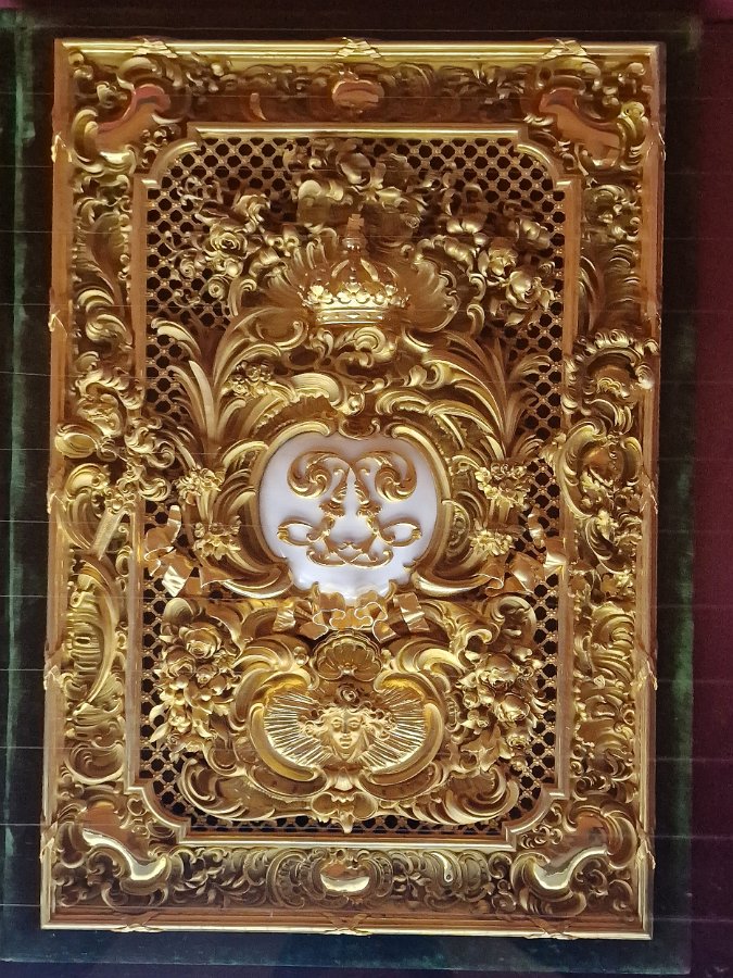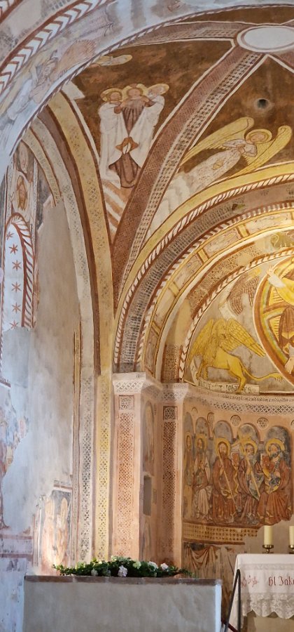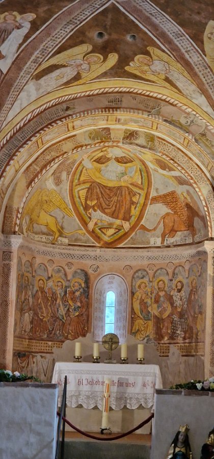 Über den Apolsteln der geflügelte Markuslöwe, darüber ein Engel, links die berühmte Dreifaltigkeit