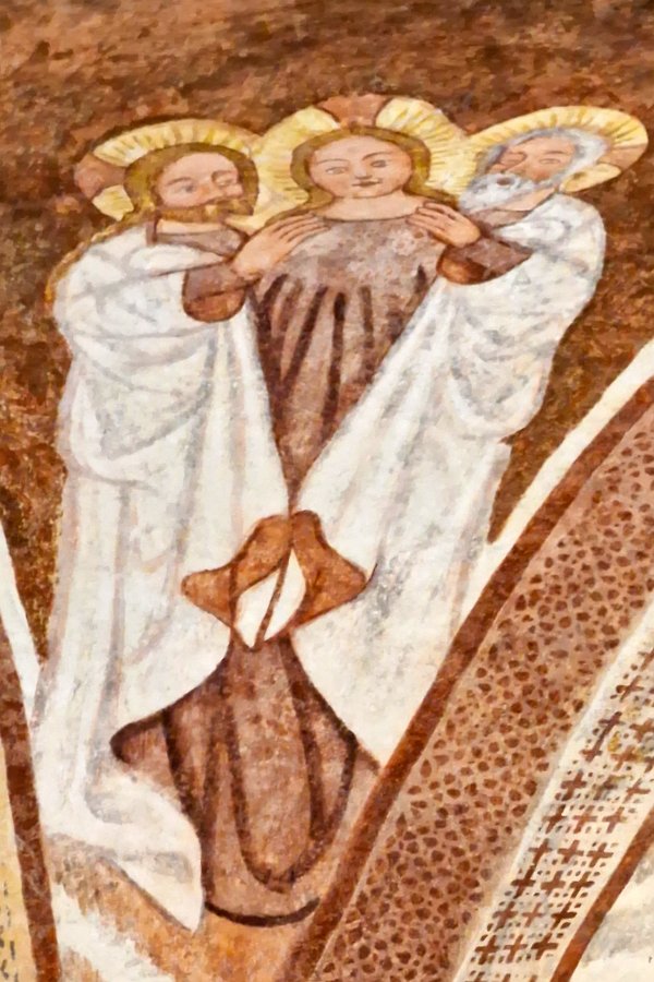 Zwischen dem weißbärtigen Greis rechts, Gottvater, und Jesus als bärtigen Mann links befindet sich die Verkörperung des Heiligen Geistes mit weiblichen Zügen. Foto: Ruth Bourgeois (STM)