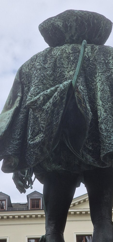 Auf schlichtem Sockel stehend zeigt die Statue den jugendlichen Fürsten idealisiert in spanischer Tracht.