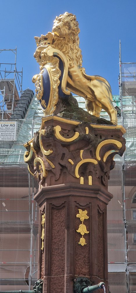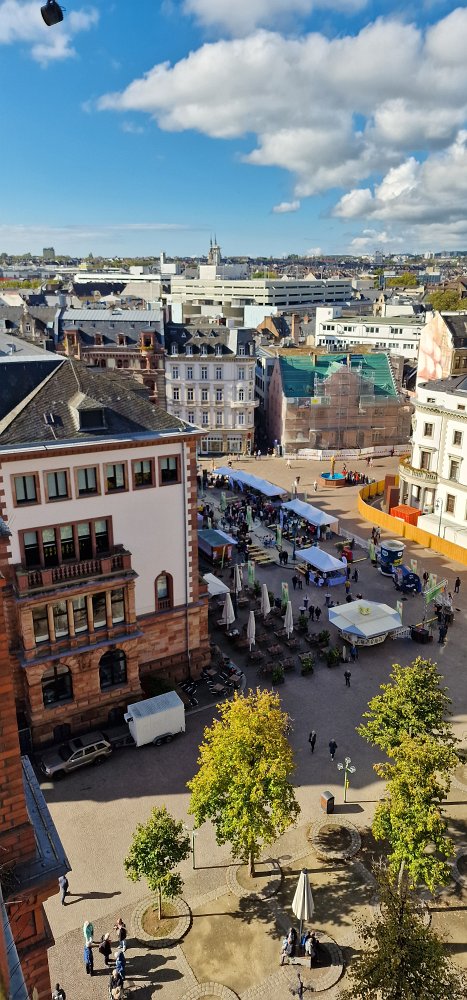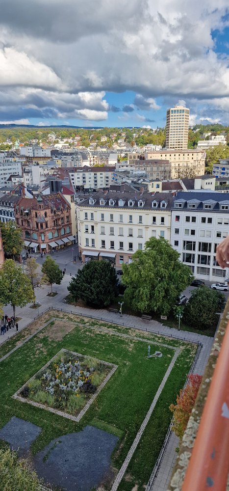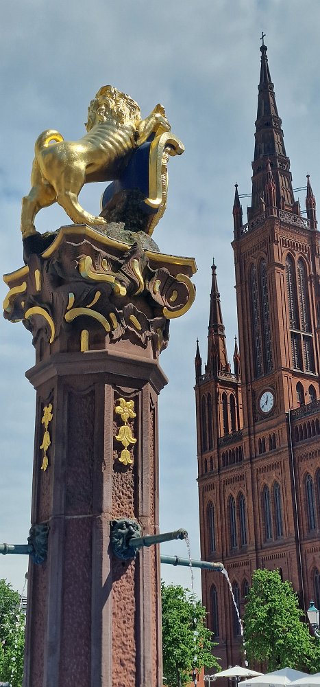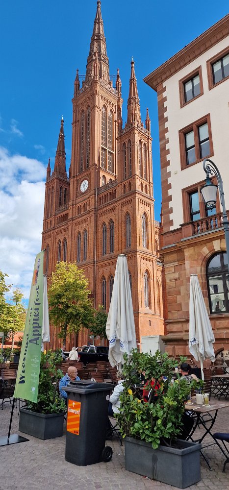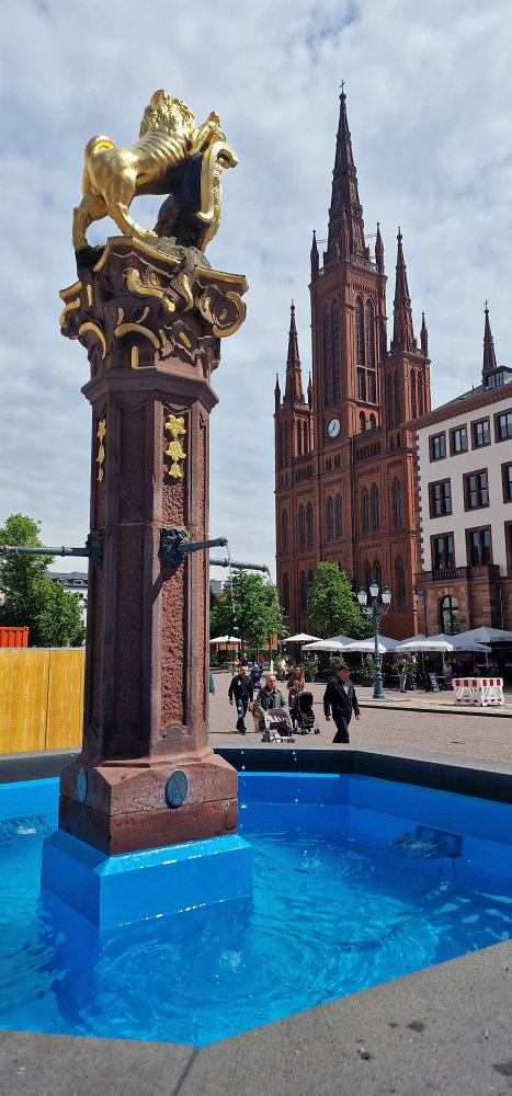 Im Vordergrund der Marktbrunnen auf dem Schlossplatz. Die neugotische Marktkirche ist die evangelische Hauptkirche der hessischen Landeshauptstadt.