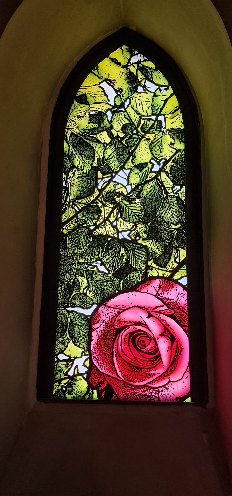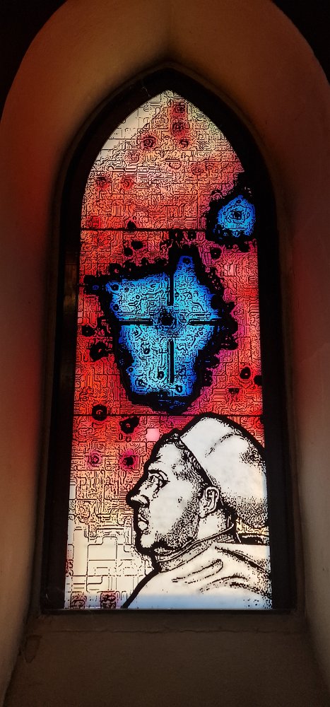 Glasfenster von Karl Martin Hartmann: die verfremdete Darstellung eines Schwarzen Lochs im Weltall kombiniert mit einem Bild des Reformators Martin Luther. Außen acht Verse aus dem Buch Kohelet (Prediger Salomo.