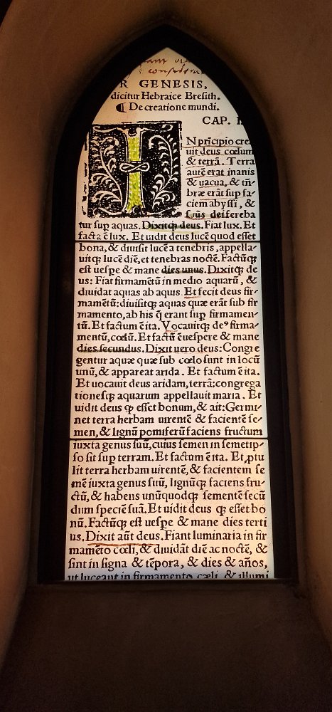 Glasfenster von Karl Martin Hartmann: der Anfang des Genesis-Textes (die Schöpfung) aus der lateinischen Vulgata. Außen Passage aus dem Korinther-Brief (1,13) über die Liebe.