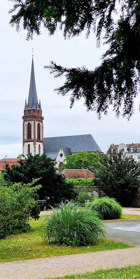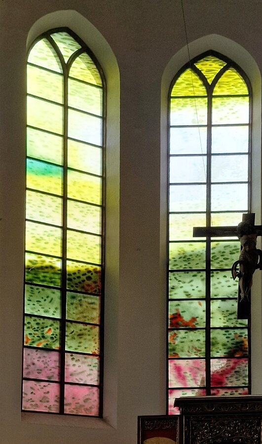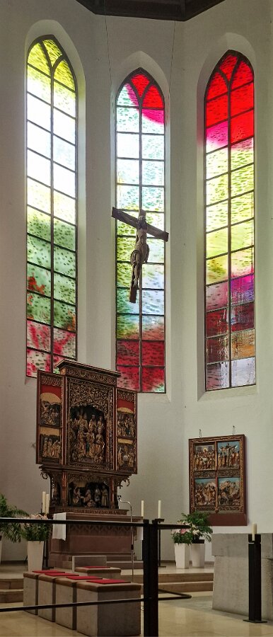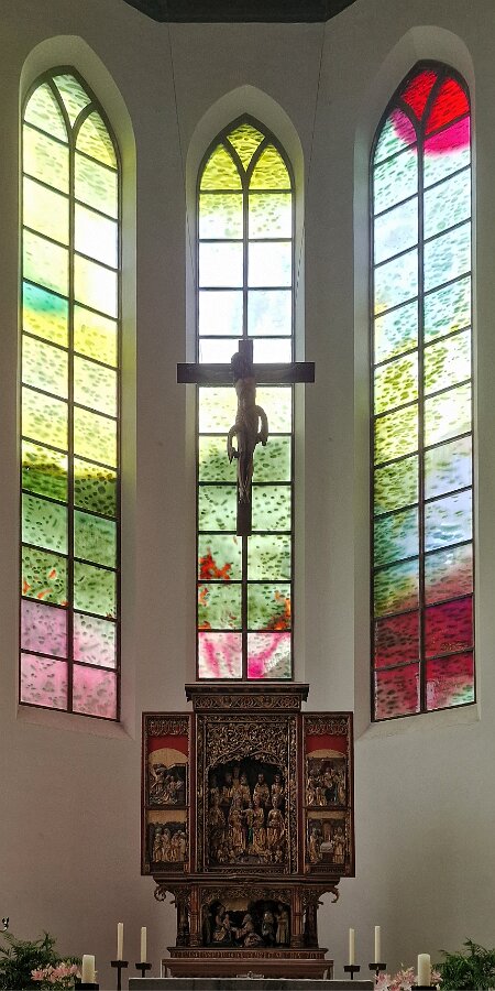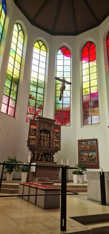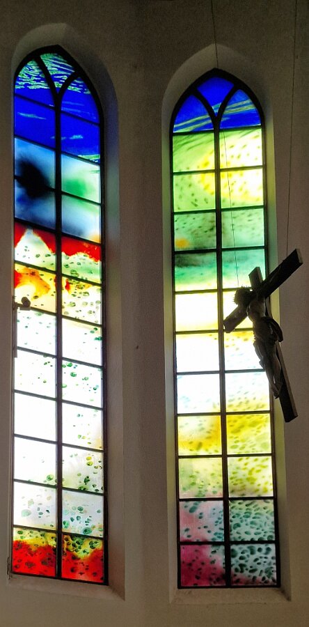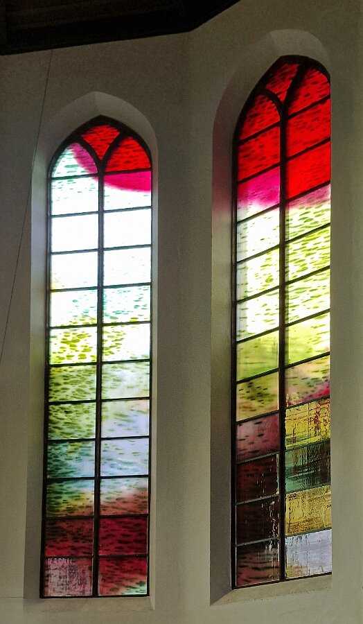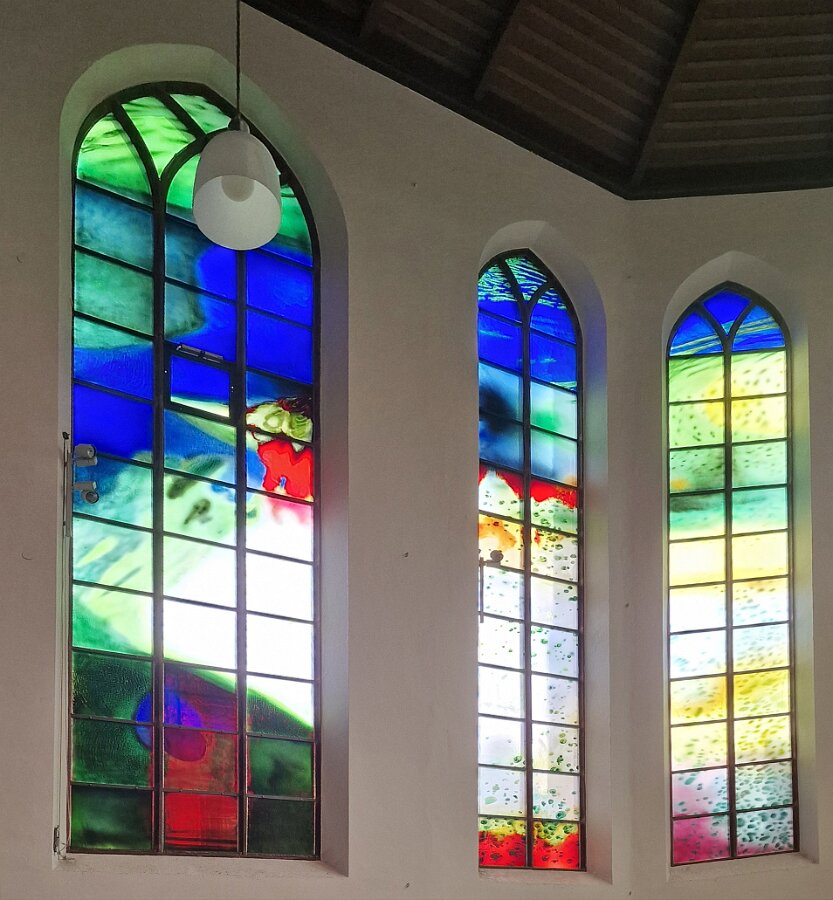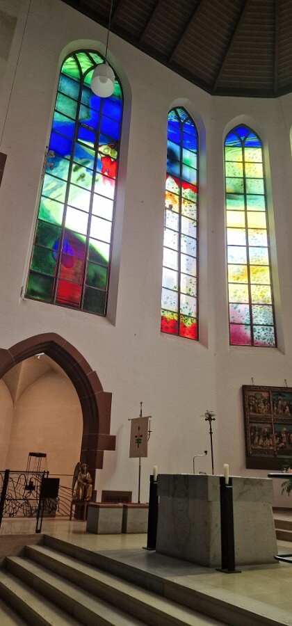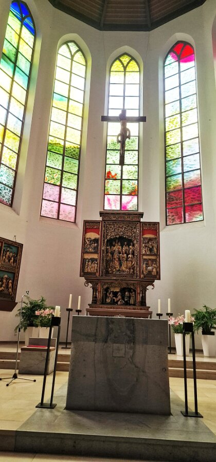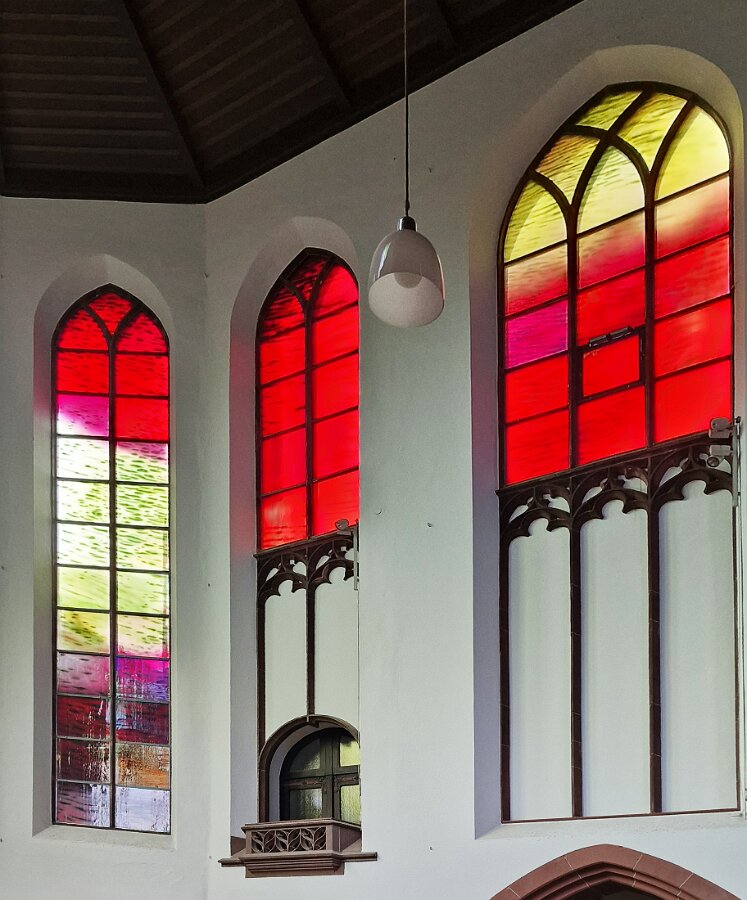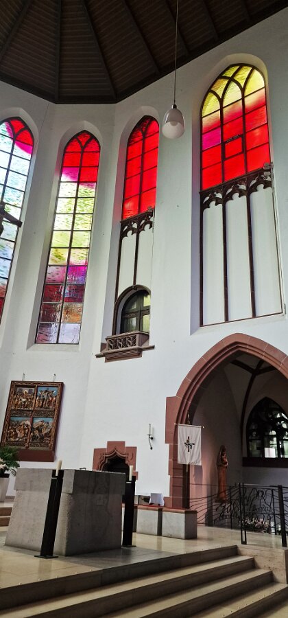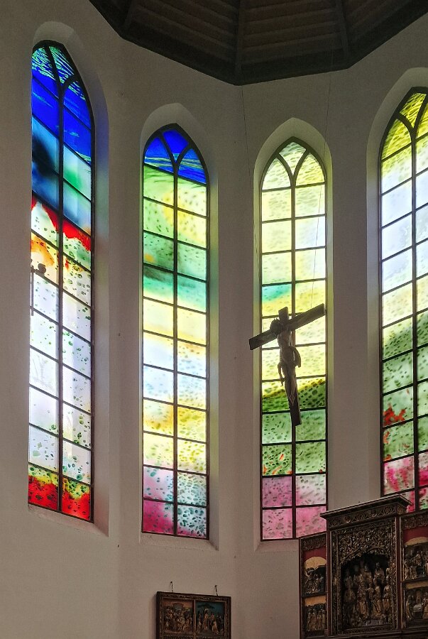 Der Altarraum der Kirche als Farb(T)raum. Je nach Sonnenstand, Wetter, Jahres- und Tageszeit wird die Kirche in ganz unterschiedliche Farben gehüllt. Markus Hau hat dazu 2019 neun Schöpfungsfenster geschaffen. Im Spiel des Sonnenlichts leuchten alle Farben der Natur und symbolisieren menschliche Gemütszustände. Die Farbfülle schließt unmittelbar an den benachbarten Prinz-Georgs-Garten an. Mehr von Markus Hau über die Entstehung der Glasfenster: https://www.youtube.com/watch?v=gNUOK3CB-24&t=1s