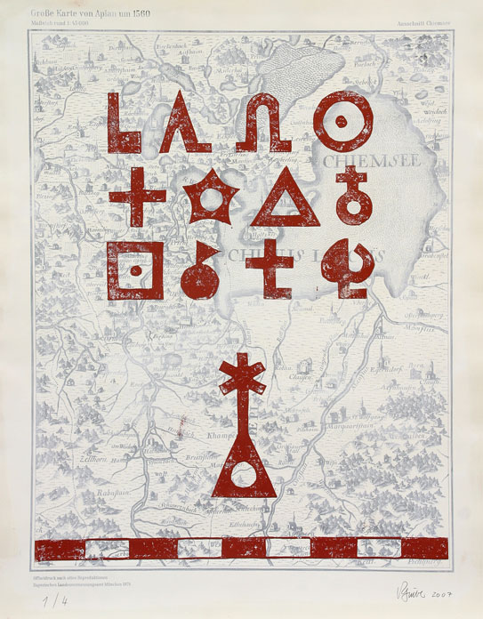 Linolschnitt auf alten Landkarten. 72 x 56 cm, Platte 54 x 47 cm, 2007